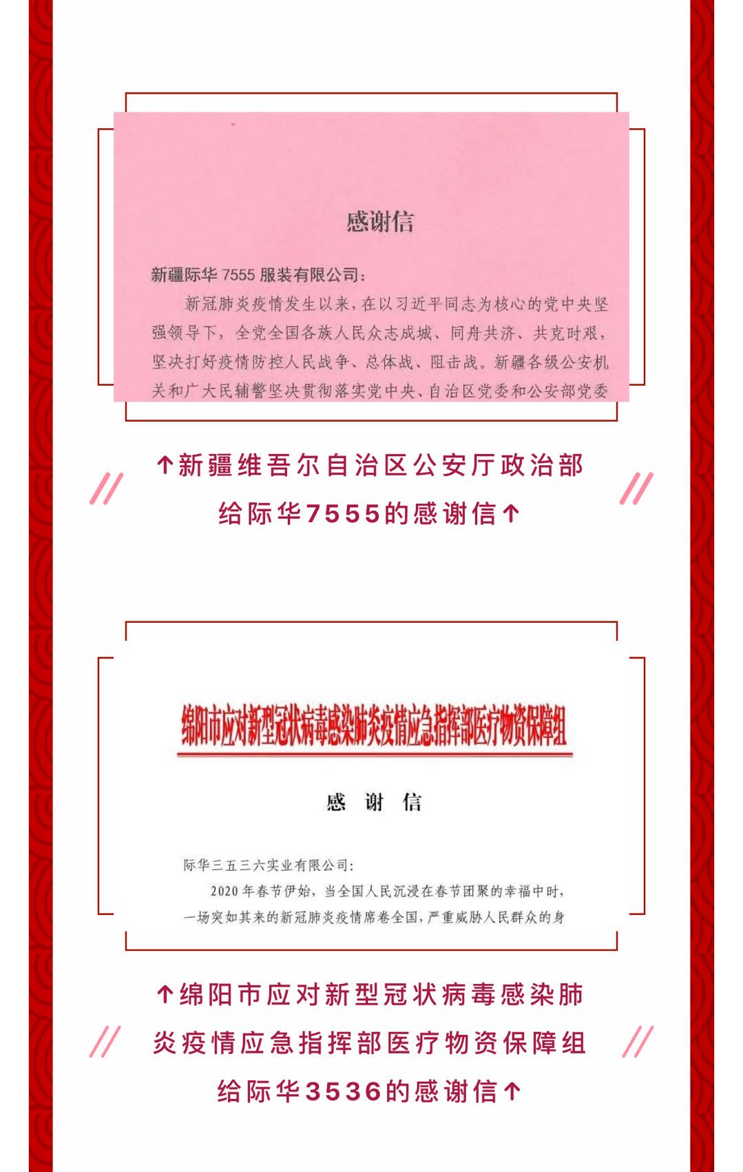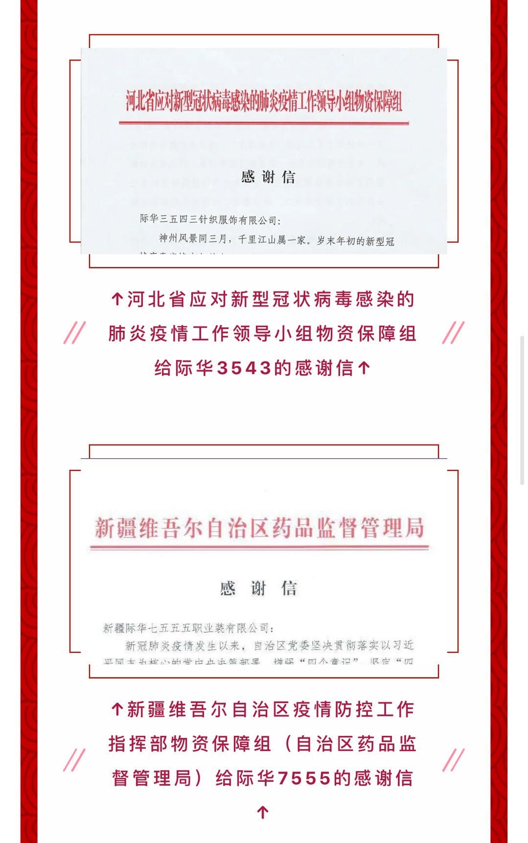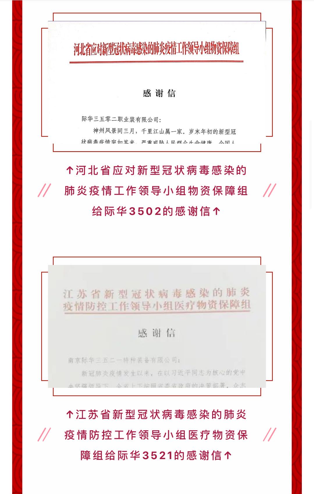 日前,又有际华集团所属3502、3521、3543、7555、3536等多家企业陆续收到地方政府和机构的感谢信,对际华企业排除万难、转产保供防护物资表示诚挚的谢意。