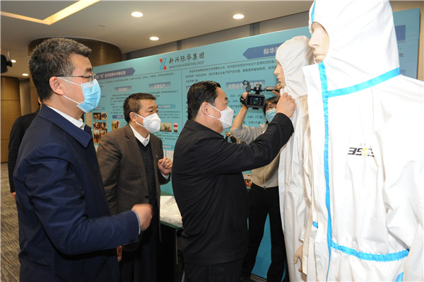 2月7日,国资委党委书记、主任、应对新型冠状病毒感染肺炎疫情工作领导小组组长郝鹏一行到新兴际华集团调研,听取集团党委疫情防控工作汇报,考察新兴际华集团疫情防控物资,指导防护服和医用药品生产保障工作,并向坚守岗位的广大干部职工表示亲切慰问和衷心感谢。国资委副秘书长赵世堂,集团党委书记、董事长张雅林,集团党委副书记、总经理杨彬,集团党委常委、总会计师荣岩,际华集团党委书记、董事长李义岭等陪同调研。