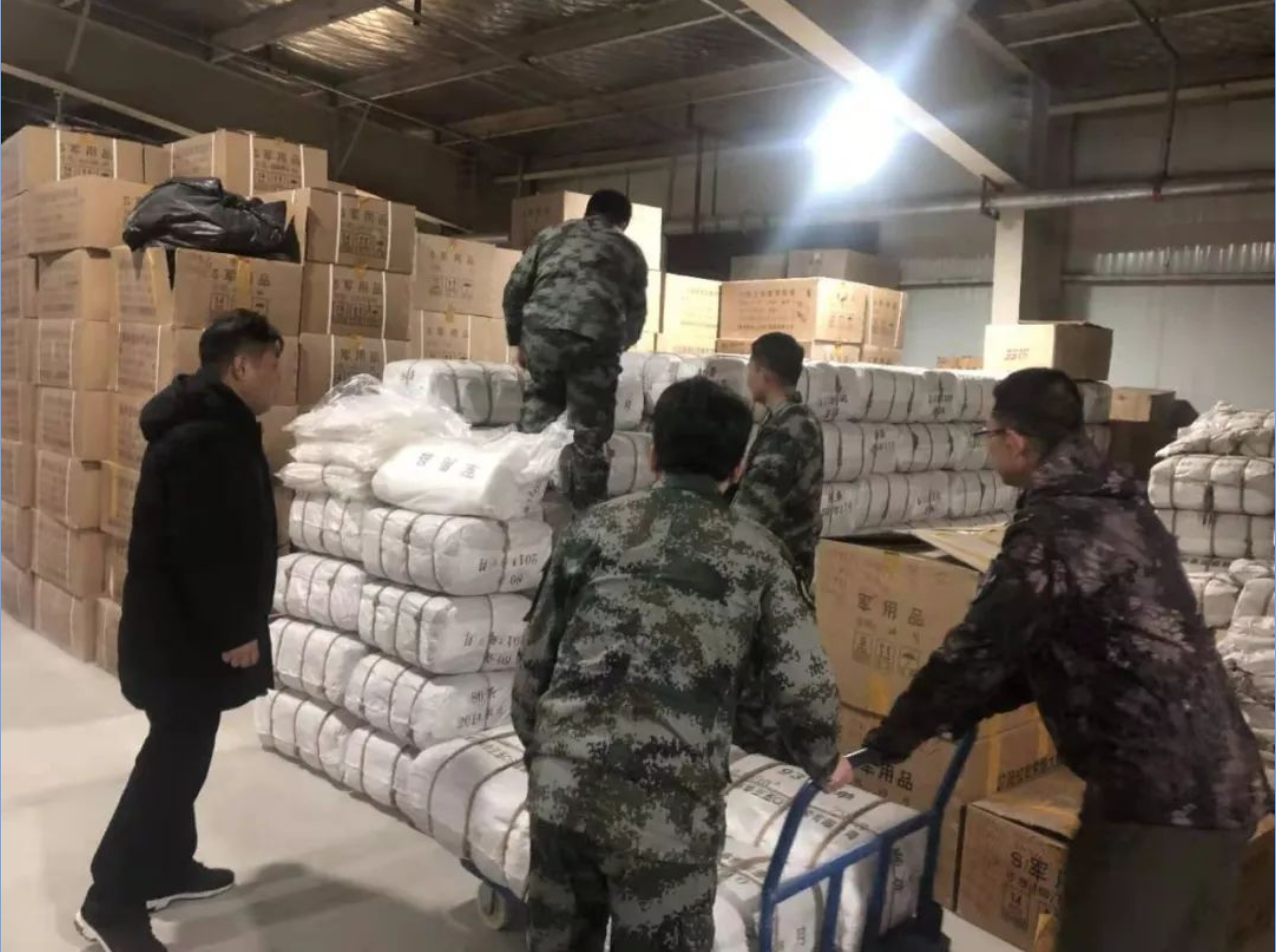 际华3503公司在除夕夜接到请求支援的电话,急需被子、枕头、床单等物资。疫情就是命令。公司特种服装部、后勤安保部等部门值班人员加班加点至深夜,将1300床被子和枕头、床单,第一时间交付疫情一线。