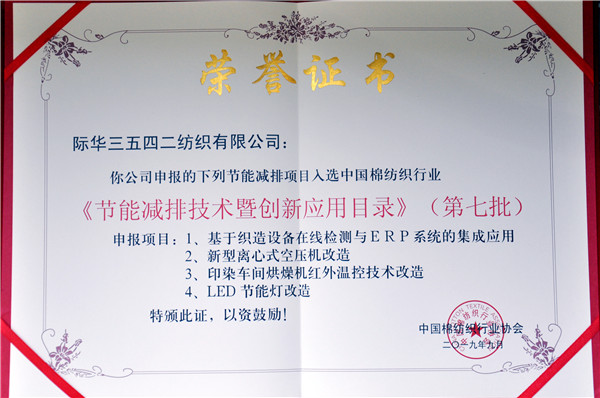 近日,中国棉纺织行业协会发布了2019年中国棉纺织行业节能减排活动结果。其中,际华3542公司被中国棉纺织行业协会命名为“节能减排创新型棉纺织企业”,公司申报的“基于织造设备在线检测与ERP系统的集成应用、新型离心式空压机改造、印染车间烘燥机红外温控技术改造、LED节能灯改造”等4个项目入选中国棉纺织行业《节能减排技术暨创新应用目录》(第七批)。
