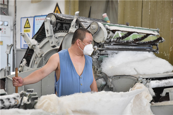 习惯了不证明温度低了,出汗少了。热熔棉被小组是两班倒的生产制度,一个班工作时间十二个小时,仅翻被子的六个人每天都要喝二到三盒藿香正气水。梳棉工袁进国说:“你看我们这里一个胖子也没有,你再看我们的皮肤是不是都很好,可都是我们免费‘蒸桑拿’的好处。”说完,他就爽朗地笑了起来。热熔棉被小组的职工大多是工作十年以上的,他们开朗乐观、吃苦耐劳,在艰苦的工作岗位上默默劳作。