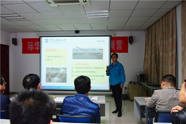 接着,前纺车间杨雪琴、准备车间雷爱军、布机车间王芬、布机车间李勇明分别从《如何做好改善提案》《利用精益看板提高浆纱质量》《交接班培训》《安全培训》等四个课题作了经验分享。