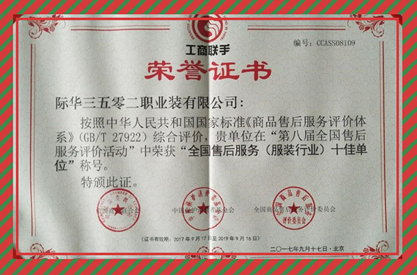同时,际华3502公司量体服务人员几十年如一日,从人性化、个性化角度设计客户满意的服务标准,做好售前、售后服务。这次被评选全国售后服务服装行业十佳单位,是对际华3502公司售后服务人员的肯定与认可。在以后的工作中,每一位量体服务人员将再接再厉,尽职做好每一次任务,服务好每一位客户。