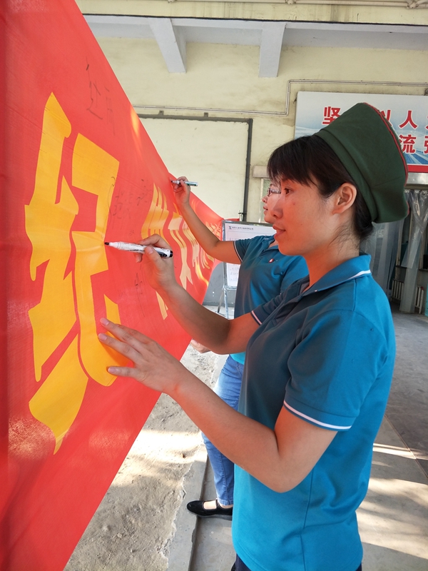 “从我做起,从身边的小事做起,遵守安全章程,遵守交通法规,做安全员工,做文明市民……”这是全国青年文明号际华3542公司细纱丙班六组组长吴珊珊的安全誓言。伴随着第16个全国安全生产月的到来,以及襄阳市创建全国文明城市的火热进行,6月16日,细纱车间青年员工在“遵章守纪 做文明市民做安全员工”条幅上签名宣誓,表达了他们做文明市民和安全员工的决心。此次活动由际华3542公司细纱车间组织,全国青年文明号细纱丙班六组10名青年带头签名,122名青年参与签名活动。