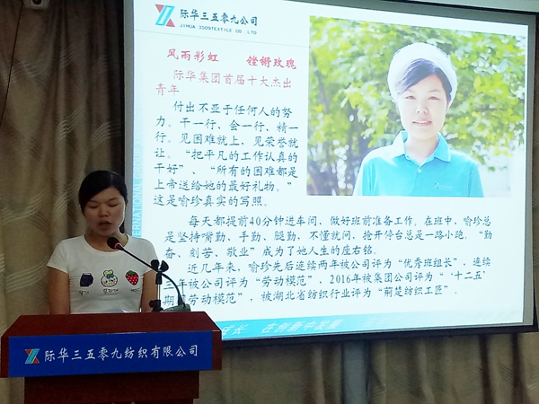 际华3509公司大力弘扬劳模精神,更好的激励青年职工的劳动热情和创造活力,通过“身边人讲身边事、用身边人育身边人”的典型事迹,使劳模的先进事迹可亲可敬可学,为公司“第三次创业”进一步凝聚青春力量,以优异的成绩迎接党的十九大胜利召开。布机车间总教练张琴以《弄挡里走出个“全国五一劳动奖章”》为题,讲述了15年来,她通过五勤:即嘴勤、手勤、勤学勤练、勤分析、勤总结,从凸轮到喷气、再从喷气到剑杆,又从剑杆回到喷气,辗转几种机型,哪里产品难度大,哪里效率提不上来,就出现在哪里,博众人之长,一步一步从一名平凡的纺织女工成长为全国五一劳动奖章获得者;准备车间穿筘值车工王婷以《不忘初心,努力前行》发言,讲述了自己工作的心路历程。她在工作中主动钻研操作技术,苦练过硬的操作本领,独自摸索一套处理问题的工作法,一及时,二稳妥,三准确,付出不亚于任何人的努力,从一名学徒成长为集团公司劳动模范;布机车间教练工喻珍以《风雨彩虹、铿锵玫瑰》为题,介绍了她用“勤奋,刻苦,执着、敬业”作为人生的座右铭,克服工作和家庭中的一切困难坚持工作,用她上小学的儿子话说:“不是工作离不开妈妈,而是妈妈离不开工作”。立足平凡岗位,取得了骄人的业绩。2011年到2015年,喻珍带领的丁班三组取得47个第一,13个第二的好成绩,超额完成各项生产任务,于今年5月被际华集团公司评为首届“十大杰出青年”。