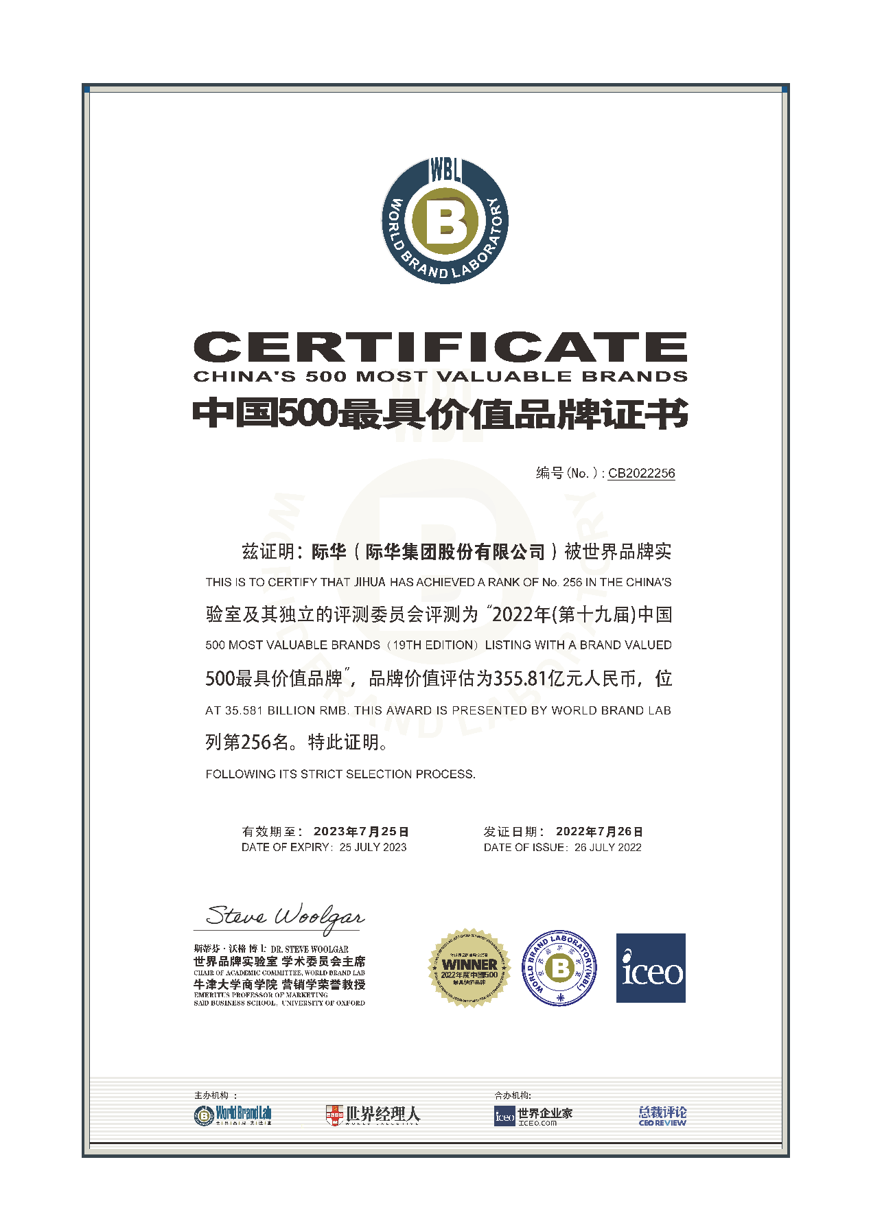 Brand Lab)主办的第十九届“世界品牌大会”于7月26日在北京举办,会上发布了2022年《中国500最具价值品牌》分析报告。基于财务数据、品牌强度、客户行为分析的评估模型,“际华”品牌价值再提升,达到355.81亿元,提升近50亿元,位列256名。