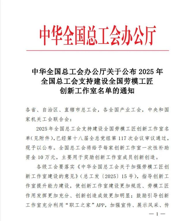 近日,中华全国总工会办公厅公布2025年全国总工会支持建设全国劳模工匠创新工作室名单,际华所属3515公司“陈虎劳模创新工作室”成功入选,这既是对际华企业推进产业工人队伍建设的充分肯定,也赋予了此工作室更重要的责任与使命。